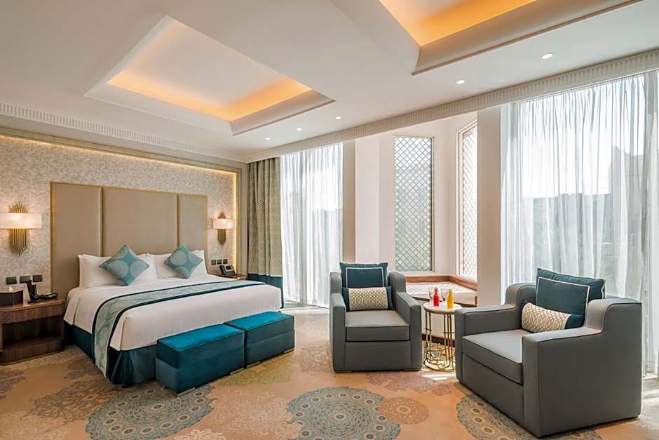This suite features a seating area with a flat-screen TV and a mini-bar with a Nespresso machine.